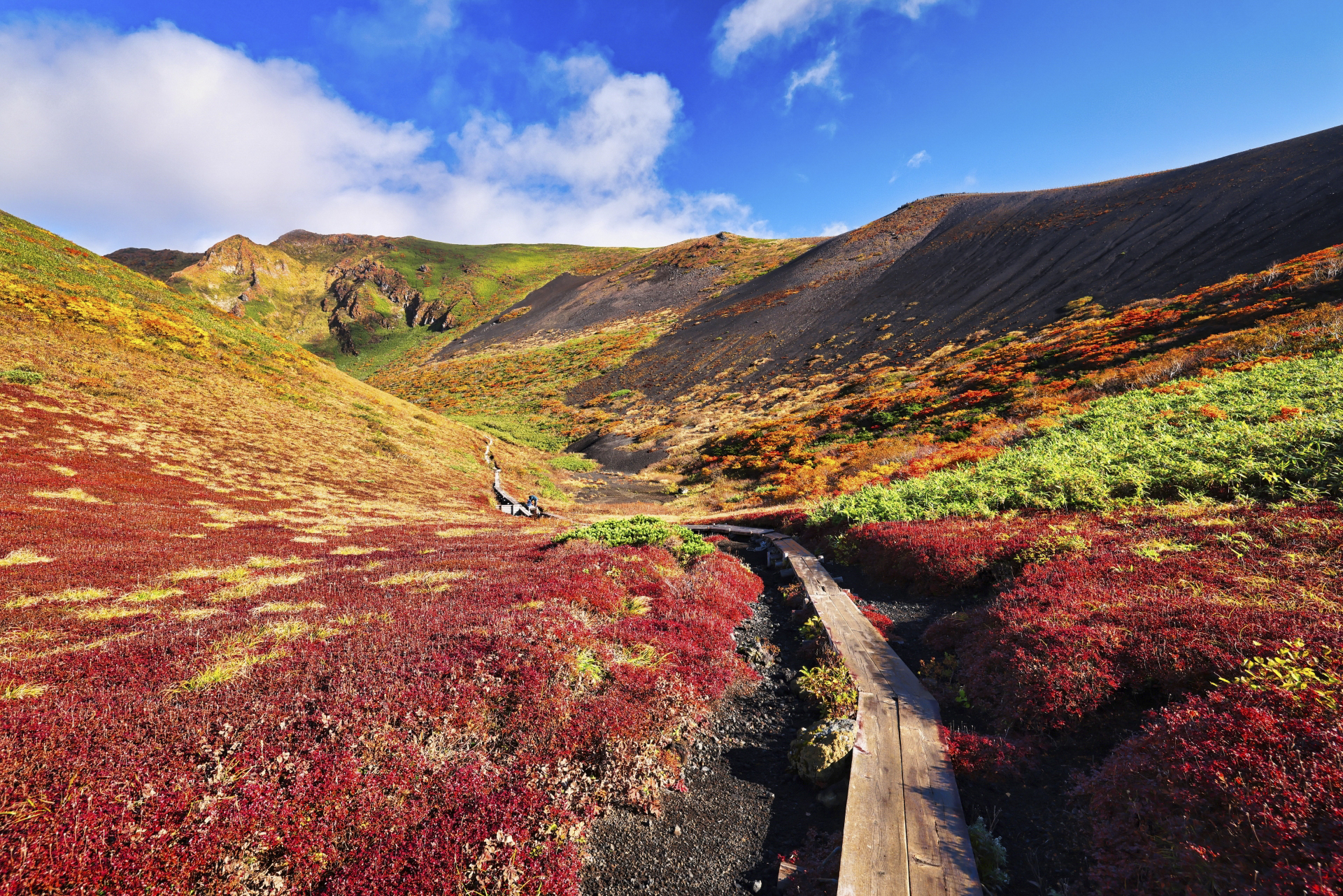 秋田・岩手の県境に拡がる、原始性に富んだ自然公園。咲きそろう高山植物や泥火山など、個性的な景観が親しまれています。